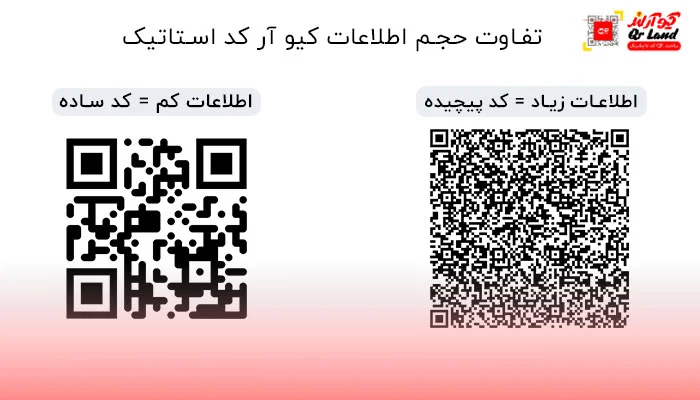 • کیو آر کد استاتیک: داده‌ها مستقیم در کد ذخیره می‌شوند و هرچه اطلاعات بیشتر باشد، کد پیچیده‌تر می‌شود.
