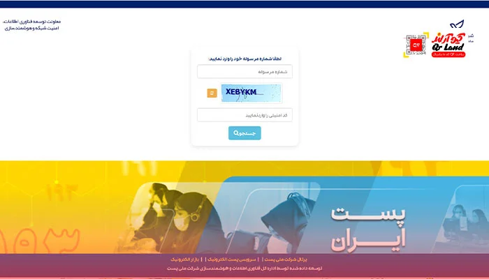 - در وسط صفحه، کادر مخصوص وارد کردن شماره مرسوله و کد امنیتی قرار دارد.
